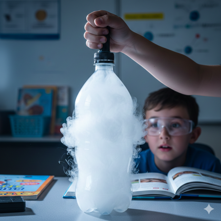안녕하세요, 코리 코딩의 코리 쌤입니다. 어느덧 차가웠던 겨울 방학이 지나고 새 학기의 설렘이 다가오고 있습니다. 지난 7주간 우리 아이들과 함께 '입자의 성질'을 주제로 달려온 과학 특강도 이제 마지막 수업만을 남겨두고 있네요. 이번 마지막 시간에는 그동안 배운 입자의 원리를 총정리하고, 흥미로운 두 가지 실험으로 대미를 장식합니다. 1. 하늘의 구름은 어떻게 만들어질까? (단열 팽창 실험) 눈에 보이지 않는 공기 입자들이 갑자기 부피가 커지면(팽창) 온도가 낮아지게 됩니다. 이때 공기 중의 수증기가 응결되어 나타나는 현상이 바로 '구름'이죠. 페트병 속 입자들을 직접 제어하며 구름이 만들어지는 원리....... <img src="https://blogthumb.pstatic.net/MjAyNjAyMjZfMTU2/MDAxNzcyMDk5MDQyOTg1.a6xA9_9RN9ksk-7zPJsMblFEMr_NTCEDyWrkihl40oUg.jvPPOhBz_VdZx7_dv2emUezu0zODwQkodU-YwQXUqOkg.PNG/Gemini_Generated_Image_pd1gl7pd1gl7pd1g.png?type=s3" />