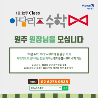 유아~초등 사고력수학 전문학원 아담리즈수학입니다. 수도권, 또 각 지역의 학군지에서 우리 아이 공부 좀 시킨다는 학부모님들은 반드시 학습시킨다는 아담리즈수학, 업계 최대 규모, 400여 종 교구 라인업과 교과서를 만드는 기업, '미래엔'의 자회사인 미래엔에듀케어에서 만든 양질의 교재로 우리 아이 처음 수학부터 창의/융합 사고력수학까지 키워주는 아담리즈수학이 강원도 최고의 교육 도시 원주의 가맹 원장님을 모십니다. 강원권 유망 지역, 원주! 원주시 전체 10세 이하 인구수의 약 30%가 밀집된 단계-무실-명륜 트라이앵글 지역! 트라이앵글 지역 내 명문 초등학교, 대형 어학원, 각종 프랜차이즈 학원들이 밀집한 원주....... <img src="https://blogthumb.pstatic.net/MjAyNjAzMDNfMjg4/MDAxNzcyNTI0NTQwMjA5.OWsH38X-qeHKktwh9_U5atEMAde-60MGLIki5ku_Bh8g.S8M1SLcWcGSghcGWgPXfHR5eCkVKlBIVPetws1UJaEcg.JPEG/%B1%D7%B8%B21.jpg?type=s3" />