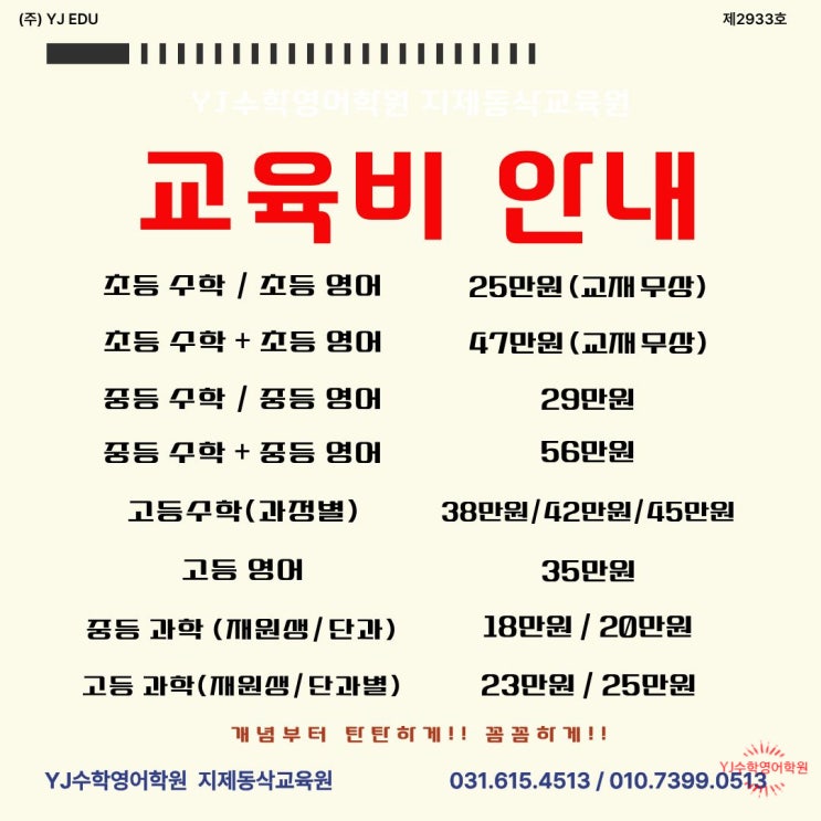 동삭동수학학원동삭동영어학원YJ수학영어학원동삭점교육비안내