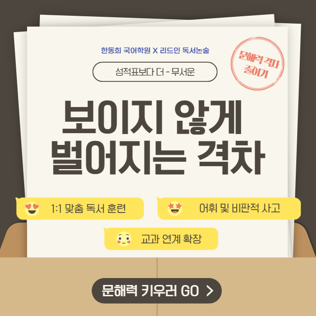 초등 국어, '성적표'가 없어서 다행이라고 생각하시나요? - 보이지 않는 문해력 격차의 무서움 안녕하세요 독서와 국어로 성장하는 한동희 리드인 국어학원 입니다 요즘 초등학교는 시험이 없습니다. 통지표에는 그저 "우수함", "잘함" 같은 기분 좋은 문구들만 가득하죠. 그래서 많은 부모님이 안심하십니다. '우리 아이가 수업은 잘 따라가고 있구나'라고 말이죠. 하지만 저는 매일 아이들을 가르치며 보이지 않는 문해력 격차를 봅니다. 시험이 없으니 아이의 진짜 실력이 드러나지 않을 뿐, 교실 안에서는 이미 읽는 아이와 읽지 못하는 아이 사이의 거대한 절벽이 생기고 있습니다. 1. 시험 점수보....... <img src="https://blogthumb.pstatic.net/MjAyNjAyMDZfMTY3/MDAxNzcwMzU2ODY3MzE3.biRnUbIiNBJQauuRE0zYnYrffgFyHMvr4Dz0FPm-eewg.CNOR4NY_iuEivZX43HgSbCTrbqtKfgffViUVezE3RLQg.PNG/image.png?type=s3" />
