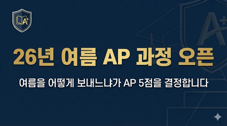 국제학교 학부모님들과 상담을 하다 보면 가장 많이 듣는 질문이 있습니다. “AP는 학교 수업만으로 충분한가요?” “여름에 미리 준비하는 게 정말 필요한가요?” 결론부터 말씀드리면, AP는 ‘학기 중 성실함’보다 ‘여름 준비 여부’가 점수를 결정합니다. 이유는 단순합니다. AP는 범위가 넓고 개념 밀도가 높고 FRQ(서술형) 비중이 크기 때문에 학기 중 내신과 병행해서는 완성도가 나오기 어렵습니다. 그래서 상위권 학생들은 여름에 이미 개념 70% 이상을 끝내고, 겨울 방학에 마무리 30%, 마지막 봄학기에 문제풀이와 FRQ만 반복합니다. 왜 여름 AP 특강이 중요한가? AP 시험은 1년에 단 한 번입니다. 한 번의 결과가 GPA, 대학 전공 경....... <img src="https://blogthumb.pstatic.net/MjAyNjAyMjVfMTI3/MDAxNzcyMDE0NTU2MDc5.B9jo6qj6lxGv5oeB2km7D_3-jRz8AQO1Vkev6LjKVrUg.a2Krw-kyi1q56bCnPIXhGy9BHPBLtOIGOOWKUeXPITEg.PNG/image.png?type=s3" />