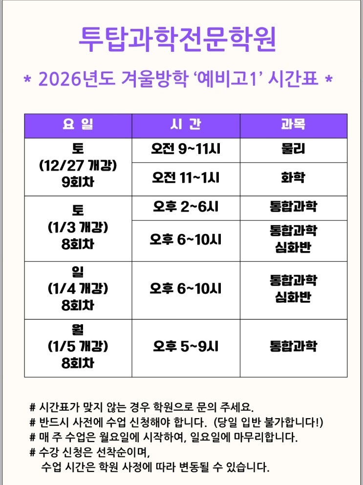 26년 12/27(토)부터 예비고1개강,1/5(월)예비고2 물리수업개강