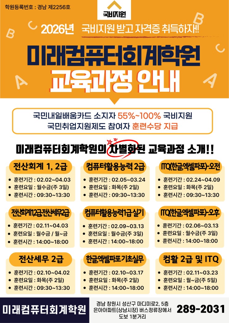 2026년 2월 국비지원 교육과정 안내드립니다. <img src="https://blogthumb.pstatic.net/MjAyNTEyMjJfMjU2/MDAxNzY2MzU4MzQ5NDgx.2ViMcMYgCd50qrwQdO1xqBVF3fqcQFrvadiLZ3Vbf7Ag.PuaS3qmZqocxXBHj1PZk0toKXljAWTJKdV6iQsV99pMg.JPEG/%C1%A6%B8%F1%C0%BB_%C0%D4%B7%C2%C7%D8%C1%D6%BC%BC%BF%E4.jpg?type=s3" />