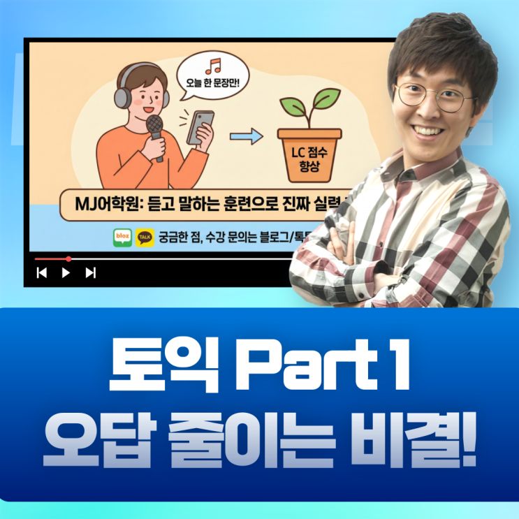 안녕하세요, MJ어학원입니다! “앉아 있는 건지, 앉으려는 건지 모르겠어요.” “sit down과 be seated 차이가 도대체 뭔가요?” 토익 LC 파트 1, 분명히 ‘보는 대로 들리는 문제’라는데… 비슷한 장면인데도 왜 계속 오답일까요? 사실 이 파트의 진짜 함정은 '동작'과 '상태'의 미묘한 차이에 있습니다. 눈앞의 장면은 그대로인데, 보기에 따라 답이 달라지는 이유. 그건 바로 동사는 '무엇을 하고 있는가', 상태 표현은 '무엇이 어떤 상태에 놓여 있는가'를 말하기 때문이죠. “하고 있다” vs “되어 있다” Part 1 핵심 전략 LC 파트 1은 주로 사진을 보여주고, 그에 맞는 설명을 고르는 방....... <img src="https://blogthumb.pstatic.net/MjAyNTEyMjNfMTY4/MDAxNzY2NDg1MTYyNjk1.jrrXY5rkC8nRGlZOiAA8AHkeRsXpLuDsSuNzgKDBoO0g.rLVrHfVfPfJB1NPEsWSMNTHONvuC-FC_sPsms_e3ibUg.PNG/%C1%A6%B8%F1%C0%BB-%C0%D4%B7%C2%C7%D8%C1%D6%BC%BC%BF%E4_-001_%282%29.png?type=s3" />