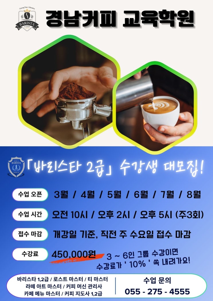바리스타2급자격증과정이 2월 26일 개강입니다. 일반과정+국비과정입니다. 수강신청링크(내일배움카드 사용) https://m.work24.go.kr/hr/a/a/3100/selectTracseDetl.do?tracseId=AIG20250000518881&tracseTme=3&crseTracseSe=C0061&trainstCstmrId=500044067063 일반인 수강신청 등록은 학원으로 부탁드립니다. 감사합니다 수강문의 055 232 4895 <img src="https://blogthumb.pstatic.net/MjAyNjAyMjJfMTMg/MDAxNzcxNzY5MDU0NTgy.7Y7Gaasy0SPfPBI7dg-98xEJhvCXmcQBPSuBhQqLfHYg.qA35cuDv61_9mee7CdcUxPFKdrIfc2wnxgGBWYlAW68g.JPEG/20260212%A3%DF202552.jpg?type=s3" />