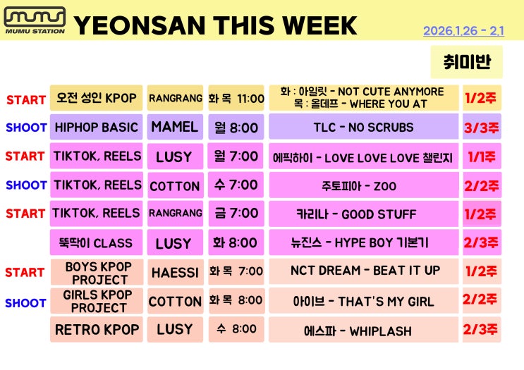 [뮤뮤댄스 연산] 금주의 시간표 2026년1월 넷째주 곡명표 2026. 1. 26 ~ 2.1