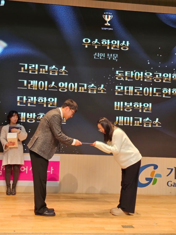 안녕하세요! 우리 아이들의 영어 자신감이 쑥쑥 자라는 곳, 삼성영어셀레나 그레이스영어교습소입니다. 오늘은 저희 학원에 정말 기쁜 소식이 있어 전해드리려고 합니다. 오늘 가천대학교에서 열린 삼성영어셀레나 비전세미나에서 바로 저희 그레이스 영어교습소가 '2026년 우수학원상'을 수상하게 되었습니다! 우수학원상, 어떤 의미인가요? 단순히 학생 수가 많아서 받는 상이 아닙니다. 삼성영어셀레나 전국 수천 개의 가맹점 중 학습 관리 시스템, 학생들의 성취도, 그리고 철저한 셀레나 활용도 등 엄격한 기준을 통과한 학원에게만 수여되는 아주 값진 상입니다. 우리 아이들이 매일 꾸준히 학습하고, 저도 열심히 지....... <img src="https://blogthumb.pstatic.net/MjAyNjAxMTBfMTcw/MDAxNzY4MDMzNzA1MDc1.zuxhwDnx8WtqWLDRz5yeRDU31TN32qVhgqh9XLUVIfwg.aiH029zXwrTWvxPxF9lL2nZ5qiSf1UyiaAnLjvurtP4g.JPEG/900%A3%DF1768033017781.jpg?type=s3" />