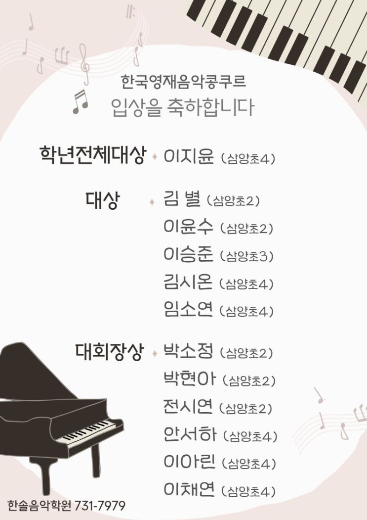 한솔음악학원 피아노콩쿨 입상을 축하합니다(2026)