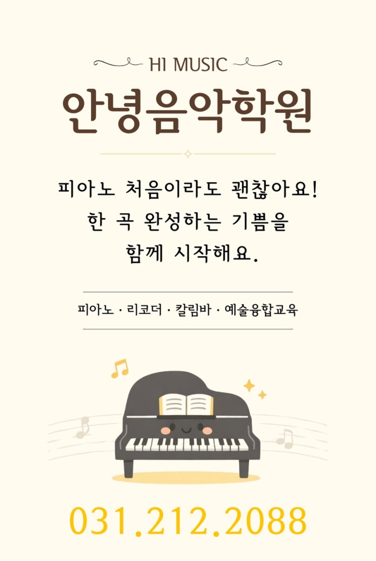 안녕하세요! 광교초 피아노학원 안녕음악학원입니다 아이의 첫 음악교육으로 많은 부모님들이 피아노를 선택합니다. 하지만 피아노 교육은 단순히 곡을 연주하는 것 이상으로 기초와 교육 방식이 매우 중요한 분야입니다. 그래서 많은 학부모님들이 “피아노는 전문 교육기관에서 배우는 것이 좋다” 는 이야기를 하기도 합니다 ☺️ 그 이유는 무엇일까요? 1. 피아노 전공 선생님의 전문적인 지도 피아노는 처음 배우는 과정에서 손 모양, 자세, 터치, 연습 방법 등 기초가 매우 중요합니다. 전공 선생님의 지도 아래 배우면 아이들이 올바른 방법으로 연주 습관을 만들고 음악을 이해하는 방법까지 함께 배울 수 있습니다. 기초가 잘....... <img src="https://blogthumb.pstatic.net/MjAyNjAzMTNfMjMw/MDAxNzczMzc3MDA0ODYw.gLzUqv1rIOxmswbu7r24fdFcuGlkGLsv7YwG2KHSxZkg.dJChBTVXdntHiPKUxeiCpqMSa3L5hR9Z3XxyVbmydt0g.JPEG/IMG%A3%DF1927.jpg?type=s3" />