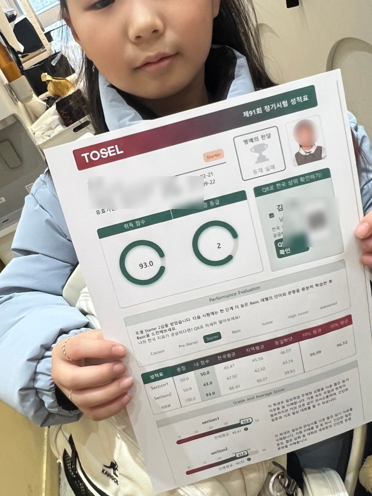 학원을 하다 보면, 가끔 시간이 눈에 보일 때가 있습니다. 얼마 전 TOSEL 시험 결과를 정리하다가 문득 그런 생각이 들었습니다. “아… 얘네가 이렇게 컸구나.” 지금은 어엿한 초등 고학년이 된 우리 아이들. 사실 이 친구들은 제가 학원을 오픈하고 그 다음 해 3월 1일, 개학과 동시에 처음 들어온 아이들입니다. 파닉스1 부터 시작한 오포초등학교 알파벳 부터 시작한 김X윤 원생 고려대 TOSEL 스타터 93점 :) 3년 후........ 당당하게 등장! 전국 보카올림피아드 대회 장려상 수상 TOSEL STARTER 93점! 그때는 초등학교 1학년, 2학년이던 정말 작은 꼬맹이들이었습니다. 처음 만났을 때의 모습이 아직도 생생합니다. 파닉스반에서 알파벳 A부....... <img src="https://blogthumb.pstatic.net/MjAyNjAzMDZfMTA4/MDAxNzcyNzg4NjI4Mzk3.BRAqWSDZyVzYbpGi-VHYr6-EukpJOngxGRhspJs8x8Ag.rcEmyQAUTPf05wOhZleTUTeLAHDNB-eAP1YWQpnQaAgg.JPEG/KakaoTalk_20260306_163000145_05.jpg?type=s3" />
