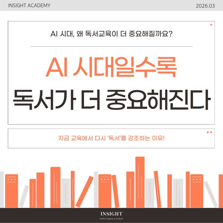 안녕하세요, 인사이트 학원입니다! 요즘 교육 관련 기사나 강연을 보면 자주 등장하는 말이 있습니다. “AI 시대일수록 독서가 더 중요해진다.” 조금 의아하게 들릴 수도 있습니다. AI가 정보를 찾아주고 요약해 주는 시대인데 왜 굳이 독서를 강조할까요? 그 이유는 간단합니다. AI는 정보를 줄 수 있지만, ‘생각하는 힘’까지 대신 만들어주지는 못하기 때문입니다. 1️⃣ AI는 정보를 정리하지만 ‘사고력’은 만들지 못합니다 AI는 이미 존재하는 데이터를 기반으로 빠르게 정보를 정리하고 답을 만들어냅니다. 하지만 이런 질문에는 AI가 완전히 대신할 수 없습니다. ✔ 이 정보가 왜 중요한지 ✔ 다른 관점은 없는지 ✔ 이 내용을 어떻게....... <img src="https://blogthumb.pstatic.net/MjAyNjAzMDZfMjIg/MDAxNzcyNzgyMjEwNjgw.jYKqn3-giqhYzuikUwZ5-Xs7SfrwcD1vKdPuOxxZsjIg.vAOMv7UESP6plMGr9WQO6KEhMuB7f6WPMJOAQN0WoF0g.JPEG/1.jpg?type=s3" />