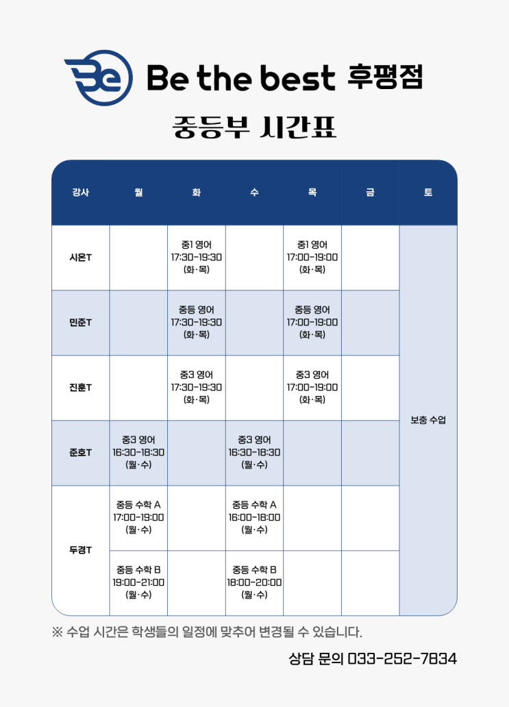 안녕하세요 박쌤수학입니다^^ 3월 정규시간표 안내드립니다. 4월이 되면 "시험대비집" 및 "오답다지기" 가 진행됩니다. 시험 전 3주 동안 시험대비보강이 진행됩니다. 궁금하신 점 있으시면 편하게 연락주세요^^ <img src="https://blogthumb.pstatic.net/MjAyNjAzMDlfMjY3/MDAxNzczMDM5OTQ2Mjc1.WKUgJRkshwlCJpN8GrcxrJP8-1_DlO_ibzSNNjzEuDgg.OoiINgL1oHTdlx1XBwaGdXN_A4uGbponqGSjN58ym0kg.PNG/2.png?type=s3" />