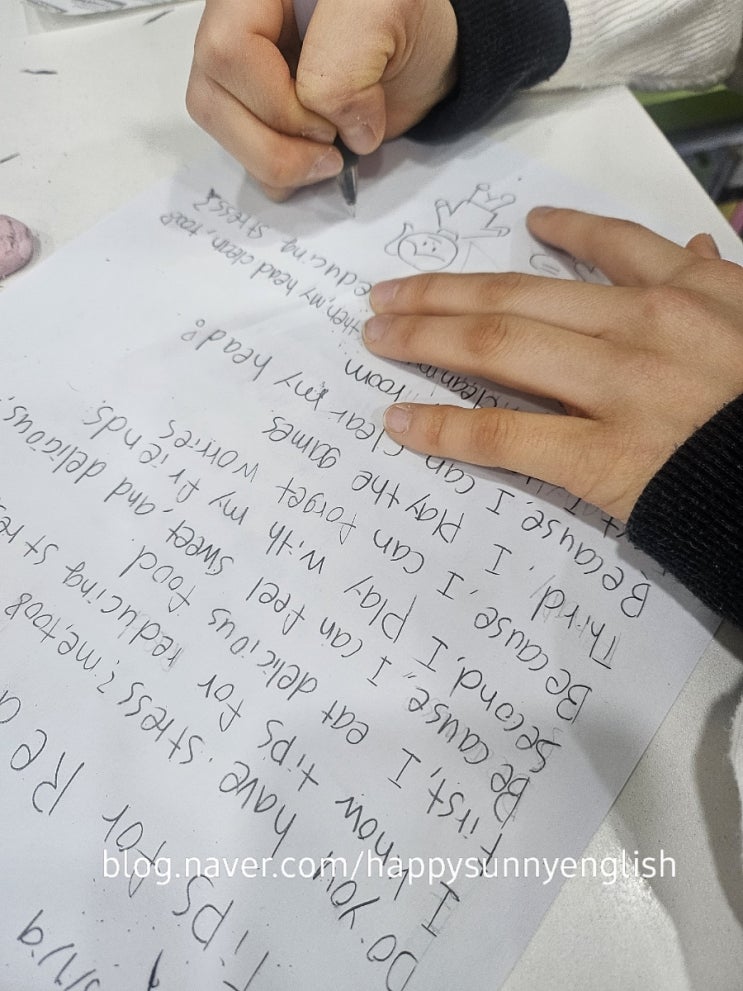 안녕하세요. 영어아웃풋 교육전문가 해피써니잉글리쉬학원입니다. 방학동안, 해피써니친구들은 영어글쓰기를 합니다. 평소 수업시간에도 영어글쓰기는 꾸준히 하고 있지만 이번 겨울방학에는 특별히 매 수업시간마다 각 주제별로 영어글쓰기를 하고 있습니다. 초등 2학년부터 꾸준하게 해피써니에서 영어공부를 하고 있는 Ellie. 언니, 오빠들 반에서 공부를 하고 있는데요~ 언니, 오빠들의 영어실력에 뒤지지 않습니다. 정말 정말 기특합니다. 해피써니는 경덕초등학교, 경산초등학교 친구들이 많이 다니고 있습니다. (( 아무래도 근거리에 위치한 이점이 있지요.)) 하지만 개신초등학교, 죽림초등학교, 가경초등학교 그리고 멀리 서현....... <img src="https://blogthumb.pstatic.net/MjAyNjAxMTBfMTMx/MDAxNzY4MDMyOTk5MDUz.yJLbYWwKLAPhGdqf4b2E39qBHr06f9MZc6NgEr4Wglwg.c3jqcYqeK-6vw9lvT9ULhf4WmsjT0Oq15Hrf-vP5gP8g.JPEG/900%A3%DF1768032995013.jpg?type=s3" />