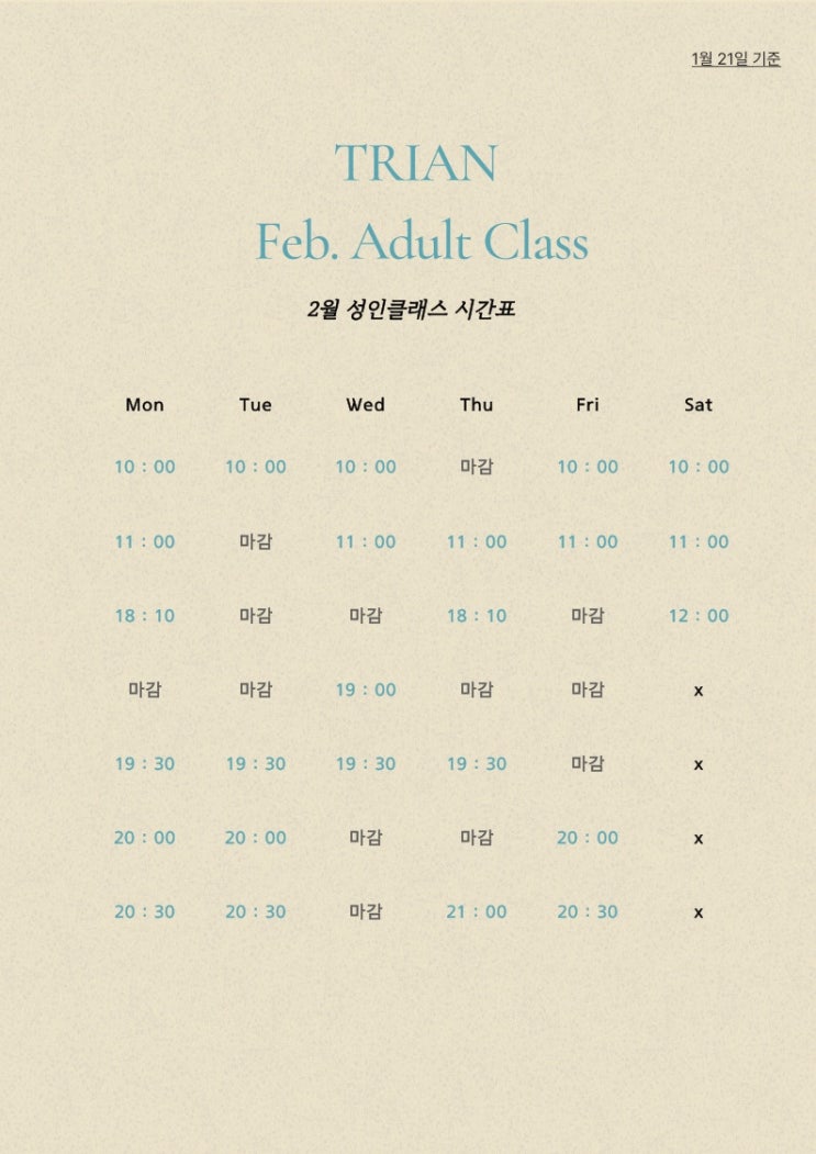 안녕하세요. 트리안음악학원입니다.️ 2월 성인클래스 시간표 2월 시간표 변동 있으니 참고해주세요 클래식 / 뉴에이지 / OST / 가요 “ 인생의 회전목마 ” “ 플라워댄스 ” 유튜브로 듣는 것도 좋지만 직접 선율을 느끼며 연주해보시는 건 어떨까요 ? EVENT TRIAN ONGOING 35일간, 한 번의 몰입보단 꾸준함으로 미션기간 : 01. 25 ~ 02. 28 1) 주 3회 이상 연습 - 5주동안 주 3회씩 -> 총 15번 연습챌린지 - 원내 • 가정 연습, 레슨일 모두 연습횟수로 인정 2) 인증샷과 기록지 전송 - 당일 연습 할 페이지 악보를 촬영하여 전송 + 날짜, 연습 할 내용 3) 챌린지 성공시 수업료 감액 이벤트 - 15번 성공시 7,000원 수....... <img src="https://blogthumb.pstatic.net/MjAyNjAxMjNfOTIg/MDAxNzY5MTc1NDgxOTQw.oL6UilsU31b70uMQ7j4-sakjDwm6GOB59LYSEp-CjF0g.Xilh_Ezq0TsTC8lwnR7yEpKZ5ESlK-IxKLuiNUhRCW8g.JPEG/IMG%A3%DF7787.JPG?type=s3" />