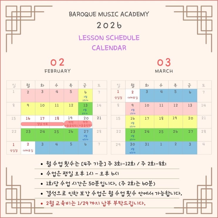 안녕하세요. 피아노 앞에서 당당한 #바로크음악교습소 입니다. 매헌 초등학교 겨울 방학 기간 동안 교과연계 악기 특강으로 2학년 대상 리코더 수업 4학년 대상 단소 수업 진행하고 있습니다. 항상 수업에 관심 가져 주시고 협조해 주셔서 감사합니다. 2026년 2월 수업 안내와 함께 구정 연휴 휴원에 대해 알려드립니다. 2026년 2월 - 3월 수업 스케줄 구정 연휴 휴원 안내 아이들과 가족 모두 따뜻하고 즐거운 명절 보내시길 바랍니다. 감사합니다.♥♥ 피아노앞에서당당한바로크음악교습소 <img src="https://blogthumb.pstatic.net/MjAyNjAxMjZfMjcg/MDAxNzY5NDAxOTA0NTU3.wiMWc7Rr-64TXRkXt0xBZl0IA_WGYFOrgvl6vRKMKzkg.w7Rz3DaMWi3CoXHhnGmrHVZ6OnEXQQI0MHsXl0Gg3KAg.JPEG/2_3%BF%F9.jpg?type=s3" />