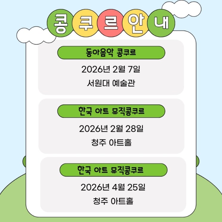 올해 상반기에는 모든 아이들이 콩쿠르 또는 연주회를 통해 무대 경험을 하게 됩니다. 아이의 곡 완성도를 충분히 살핀 뒤, 대회(또는 연주회) 1~2개월 전 학부모님께 개별적으로 연락드리겠습니다. <img src="https://blogthumb.pstatic.net/MjAyNjAxMjdfMTQ5/MDAxNzY5NTE0NTg2NDMz.tC5dFqLMZjUfS7u2ya7vF3HAxJF6iLmyS_92_0FK7hog.9tF5Qel_jTw_D6XxxTA_ohfeyjDaENS3-z-lYNr9mvUg.JPEG/900%A3%DF1769514559152.jpg?type=s3" />
