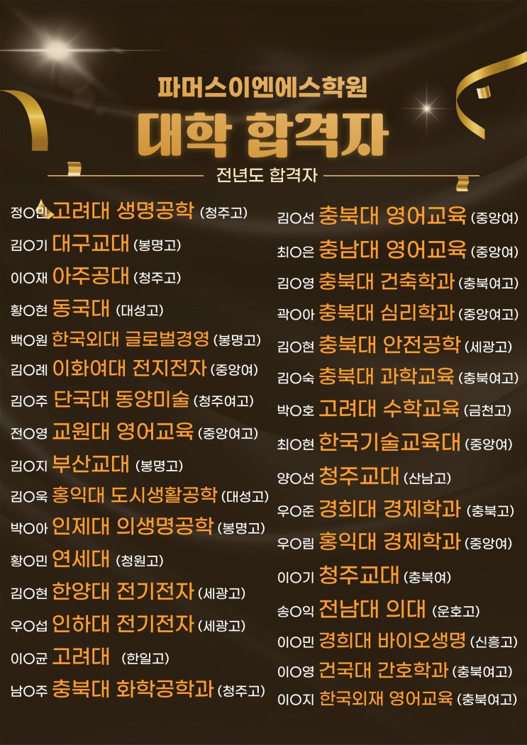 안녕하세요? 청주 봉명동 초등 중등 고등 영어 수학 학원 파머스이엔에스학원입니다 그동안 열심히 공부하고 준비해서 결과를 이루어낸 언제 어디서나 빛나는 우리 재원학생들의 선배님들입니다 선배님들의 뒤를 이어가는 우리 재원생들의 앞날을 응원합니다 파머스이엔에스영어수학학원 <img src="https://blogthumb.pstatic.net/MjAyNjAxMjdfMjU2/MDAxNzY5NTE2NjY1MDAz.1ccB-NTpJpZt4QU4xJ7ZFCbJXFzdC--uV0H1RPNUsqUg.kTrqqG_3vr-VfC802QzEICT0qalg6qBGaAB8J3CkjrUg.JPEG/%C1%A6%B8%F1%C0%BB-%C0%D4%B7%C2%C7%D8%C1%D6%BC%BC%BF%E4_-001_-_2026-01-27T204834.270.jpg?type=s3" />