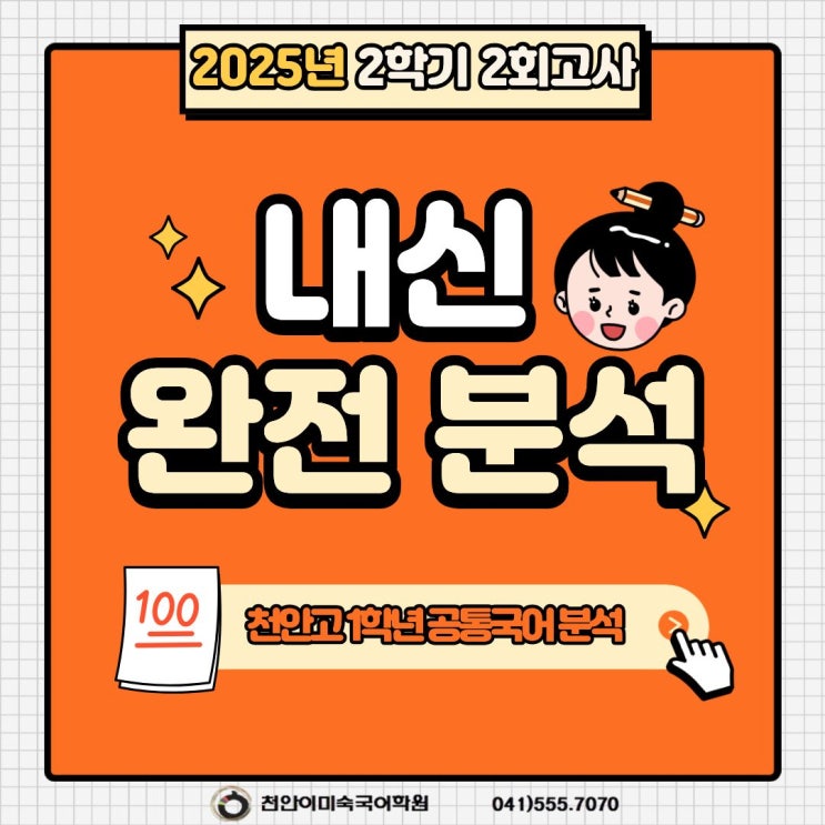 안녕하세요 천안 이미숙국어학원입니다 오늘은 천안고등학교 고1 2학기 국어 기말고사를 기준으로 시험 범위, 문항 구성, 난이도, 그리고 학생들이 특히 어려워했던 고난도 문항을 중심으로 분석해 드리겠습니다. 천안고등학교 1학년 2025년 2학기 2회고사 국어 내신 분석 1. 시험범위 및 문항 구성 천안고 1학년 국어 시험은 미래엔(신유식) 교과서를 중심으로 출제되었습니다. 교과서 범위는 3(1) 변화하는 국어의 모습 3(2) 한글 맞춤법과 오늘날의 국어 생활 외부 지문으로는 2025 고1 10월 모의고사 화법과 작문, 독서 지문이 활용되었습니다. 문항 구성은 선택형 28문항 / 100점 만점으로 구성되었습니다. 2. 난이도 총평 전반적....... <img src="https://blogthumb.pstatic.net/MjAyNTEyMThfMzgg/MDAxNzY2MDUxODkyNTY2.fkMs0zrBAI0Wf2_bALxzn6AVxjdcdXWDdvhBR6h1ldsg.cjJNDDyDShe6gKRzzKpkw68f8Tjisj1UkdFekLw82tQg.JPEG/1.jpg?type=s3" />