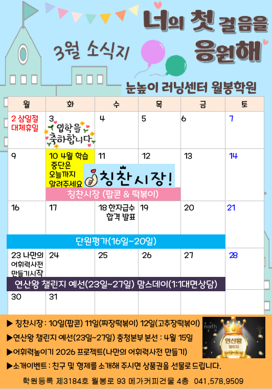 눈높이 러닝센터 월봉학원 3월 소식^^