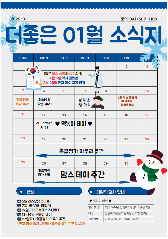 학부모님 안녕하세요. 천안 신불당동 눈높이러닝센터 더좋은학원입니다. 눈높이 더좋은학원 1월 소식 전해드립니다^^ 겨울방학이 시작되는 달로 더욱더 꼼꼼하고 세심한 관리로 알찬 방학을 보내도록 하겠습니다 ^^ 새 해 복 많이 받으세요~♡ 문의전화 ☎ 041 - 567 - 1109 ☎ <img src="https://blogthumb.pstatic.net/MjAyNjAxMDVfMjA5/MDAxNzY3NTk4NzgxMTk5.Z_LB_6AEgwtbOPmRtkScLm5cgYLHUckvO-D_Sec3y-gg.D1GFFc8g3v_Pt-FuQ43xnM0yKHshgrgoCHX2Bs95JMQg.PNG/image.png?type=s3" />