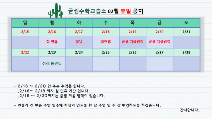 안녕하세요 굳셈입니다. 26년 양력 설 연휴가 다가오고 있습니다. 아이들이 방학기간 동안 공부를 일이 아닌 성장을 위한 과정으로 하루 중 일부로 받아들일 수 있도록 가정에서도 번거로울 수 있으실 텐데 도움을 주시어 감사드립니다. 설연휴 기간 동안 어머님들께서는 고생많으실 것이 분명한 일이지만 건강하고 평안한 설연휴 되시길 기원드립니다~ 26년에도 굳셈에서 공부하는 아이들이 건강한 마음으로 공부할 수 있도록 노력하겠습니다. 감사합니다. <img src="https://blogthumb.pstatic.net/MjAyNjAyMDZfMjI1/MDAxNzcwMzYxMjgwMTEx.2PHsjm6RsW_DOrAnb-lF_qLNVzPAy-CbnD52t4L-T3Ig.eT31QEPbLHI2IahauE4DvHURNKeNYGjaAtX9JiygAlMg.PNG/26%B3%E2_02%BF%F9_%BC%B3%BF%AC%C8%DE_%B0%F8%C1%F6.png?type=s3" />