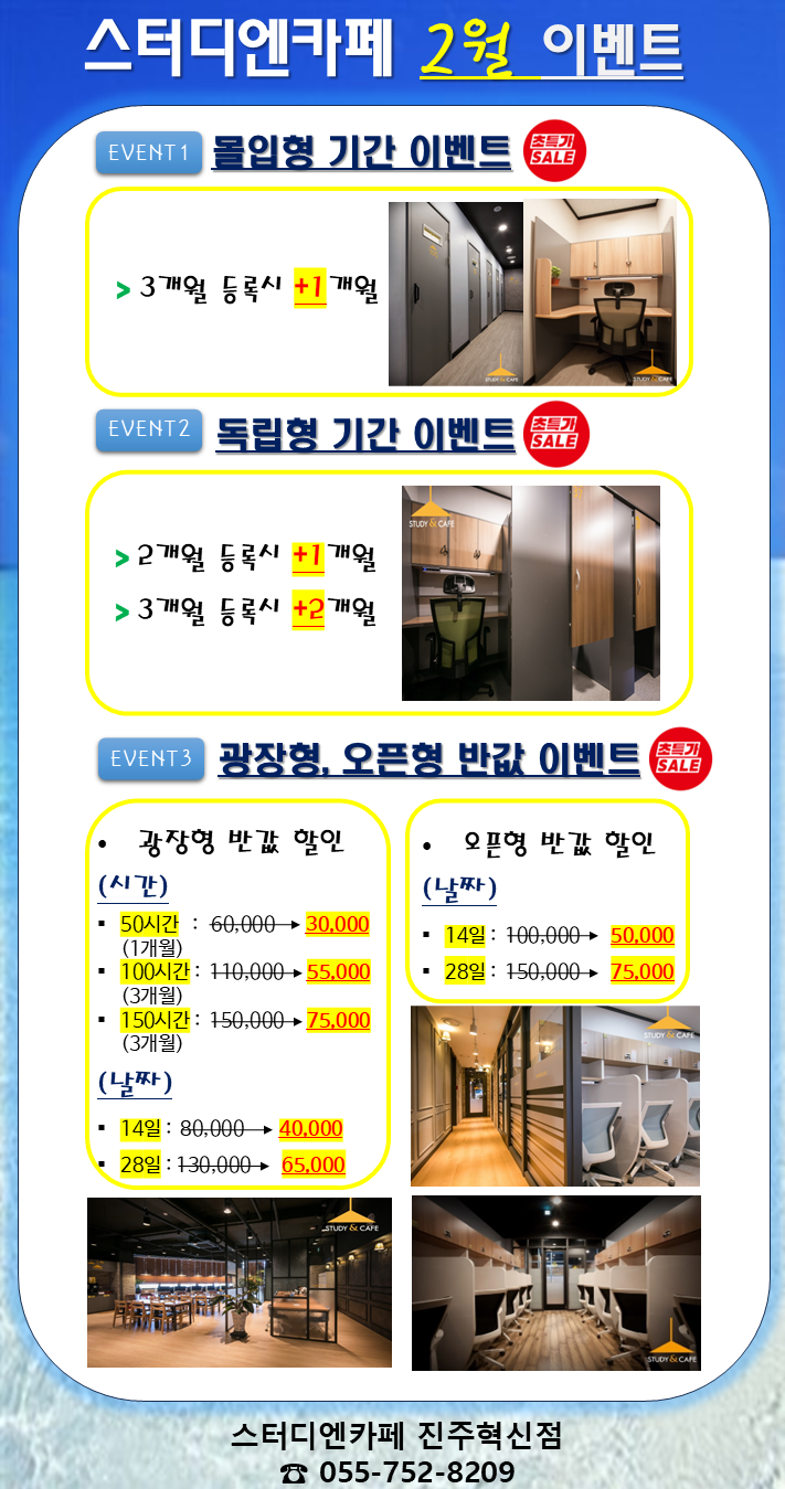 안녕하세요! 진주혁신도시 스터디엔카페 독서실입니다 모두들 새해복 많이 받으세요!! 목표한 대학을 위해 준비하는 고3 수험생과 N수생 공무원/자격증 시험을 준비하는 분들을 위한 스터디엔카페 2월 특별이벤트를 진행합니다! 자리소진 될때까지만 진행하는 이벤트이니 경제적으로 공부하고 싶은 회원님들은 빠른 문의 부탁드려요!! 모든 이벤트는 중복할인이 불가능한 점 양해부탁드립니다 독립형 및 몰입형 좌석은 대기자가 발생 할 수도 있으니 등록 전 전화 상담 부탁드립니다! 앞으로도 중간중간 다양한 이벤트 예정이오니 자주 블로그 방문해주세요^^ 감사합니다. 프리미엄 독서실 가격 문의 및 상담 055 - 752 - 8209 (칠오이 빨리공부....... <img src="https://blogthumb.pstatic.net/MjAyNjAxMzFfOTgg/MDAxNzY5ODY2Mjc5NzY5.LYJxTpiFrF10HosGlAByf0TrBxxYMP32iVxn6BoIxQEg.CS7Uxbg_LpCU6crMEwCm3W0q6sZ7m5GLhunU5z9SwQog.PNG/26.02_%C7%CE.png?type=s3" />