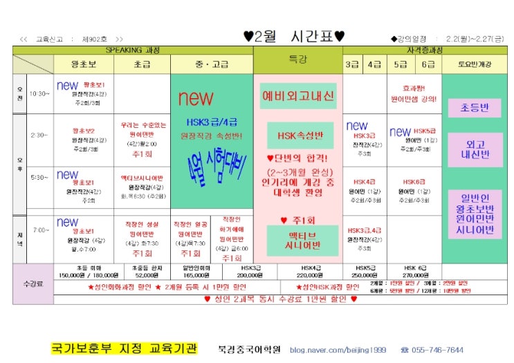 진주중국어/진주북경중국어학원/지도학생 제6회 경상남도 중국어 말하기대회 1위수상/보훈부 지정교육기관/HSK단기합격] 2월시간표올립니다.