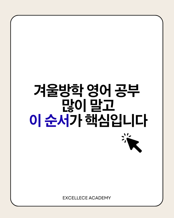 서론|왜 겨울방학 영어는 매년 실패할까? 겨울방학이 끝나면 이런 상담이 가장 많이 들어옵니다. “방학 동안 영어 학원 다녔는데 성적이 그대로예요.” “단어도 외웠고 문제도 많이 풀었는데 왜 안 오를까요?” 문제는 노력의 양이 아니라, 공부의 순서입니다. 영어는 쌓아 올리는 과목이지, 한 번에 끌어올리는 과목이 아닙니다. 본론 ①|겨울방학 영어 공부의 정답 순서 1️⃣ 단어 단어는 영어의 재료입니다. 하지만 단어만 외우면 절대 성적은 오르지 않습니다. ✔ 핵심은 무작정 암기 ❌ 문장 안에서 쓰이는 의미 이해 ⭕ 2️⃣ 문장 구조(문법) 대부분의 학생이 여기서 무너집니다. 주어·동사 구분 못함 긴 문장 해석 불가 해석이 항상....... <img src="https://blogthumb.pstatic.net/MjAyNjAxMTBfNjAg/MDAxNzY4MDM5NjkyNDg3.DhGy4AWf666ia2QkM2lJU1aaKFH4vUzAFFHY6SOl0tsg.cvWLeSFZ4_-d1NmNdiHmT_fMHZuHyJaWE9ZyBnM4ltgg.PNG/1.png?type=s3" />