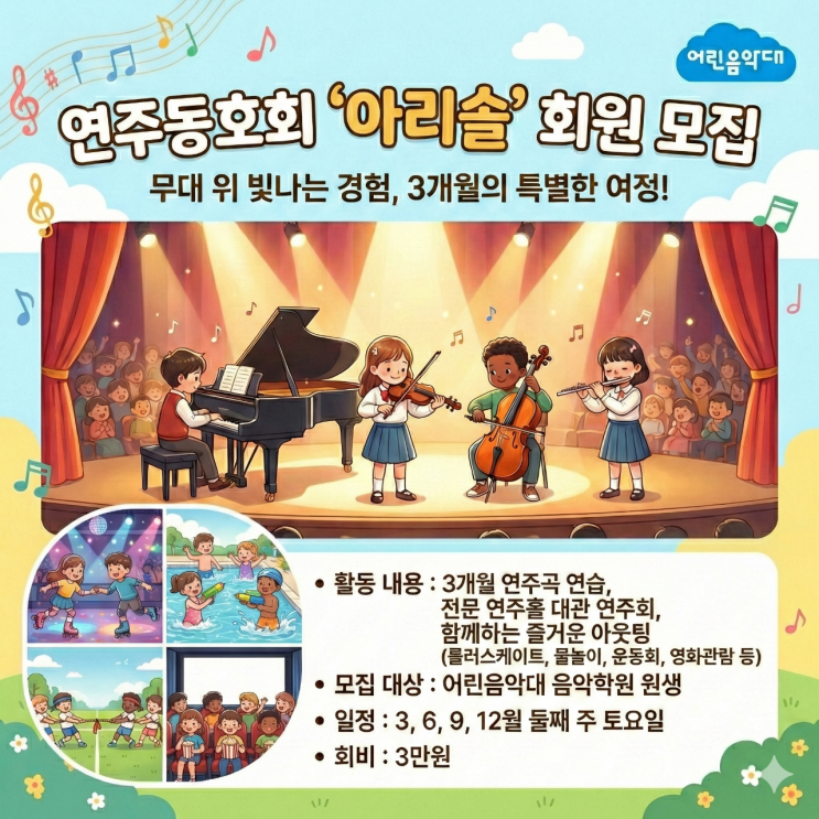 교리초 해빛초 피아노학원 음악동호회 '아리솔' 2026년 신규회원 모집 #교리초피아노학원 #해빛초피아노학원 #기장피아노학원 #교리피아노학원 안녕하세요, 어린음악대 교리원입니다! 2026년 새해 연휴 다들 잘 보내셨나요? 이 글을 읽으시는 모든 분들이 새해에는 즐겁고 행복한 일들만 가득하시길 바래요 새해에도 저희 어린음악대는 아이들의 폭넓은 음악경험을 위해 부단히 노력하고 있는데요, 그 중 하나인 '아리솔'을 소개하려고 합니다! 아리솔은 어떤 동호회인가요? 아리솔이란 학원에서 연습한 곡을 가지고 다른 여러 학원들과 함께 모여서 연주하는 음악동호회인데요, 단순히 연주만 하는 것이 아니라 청음 훈련, ....... <img src="https://blogthumb.pstatic.net/MjAyNjAyMjBfMjMx/MDAxNzcxNTc2MDk0MDY0.Q1JIyBHj8FiISQMOfSSUbUwYO_ymPtp1O7FbaMuGvRsg.nsHbVkhaslk6iXIx1pxmM6JX8uuCN2ytyCVkmVpNekIg.PNG/2026%BE%C6%B8%AE%BC%D6%B8%F0%C1%FD.png?type=s3" />