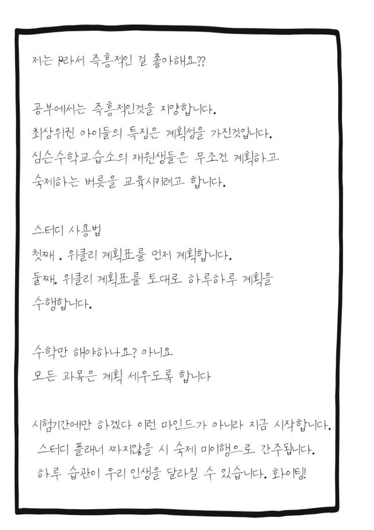 안녕하세요. 2025년도가 마무리 되어가는 시점입니다 . 어제는 크리스마스여서 따뜻한 크리스마스 보내셨나요? 믿고 맡겨주신 덕에 아이들과 올해도 호흡할 수 있었던 같습니다. 심슨수학교습소는 따로 방학이 있는가요? 마지막 주는 쉬어간다보다는 시수를 생각해서 공휴일을 몇일은 쉬어가고 있습니다. 그리고 방학동안은 초등학생은 주2회 했던 친구들은 주3회 늘려서 수업을 진행할 예정이고 고2 학생들은 대수, 미적분1을 1학기 두 과목을 동시에 시험을 실시하기 때문에 주4회로 회차를 추가해서 진행할 예정입니다. 방학은 쉬어가는 시기가 아니라 부족분을 채워 할 시간이라서 생각합니다. 다만, 쉼과 보완을 철처하게 하려면 계획성을 가....... <img src="https://blogthumb.pstatic.net/MjAyNTEyMjZfMjg2/MDAxNzY2NzE3NDc4Mzk4.zpKuP_u8ZBu5f83Lb7KNspd0GKKMEU9GJ4pwiOZ4eAwg.mKJEr503ViWFjs-aofYAiMmYeU4eF61BnjIGy4ktR0wg.JPEG/%C1%A6%B8%F1%C0%BB_%C0%D4%B7%C2%C7%D8%C1%D6%BC%BC%BF%E4..jpg?type=s3" />