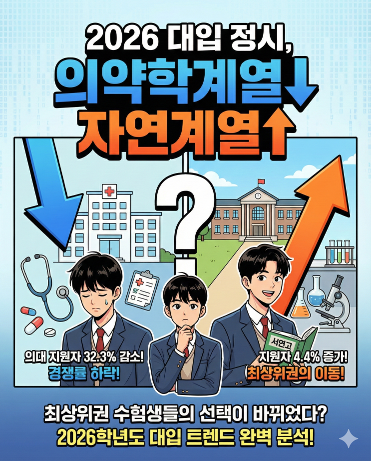 [입시정보] [ 의대 열풍 주춤? 의약학 지원 24% 급감, SKY 자연계는 늘었다! 2026 정시 결산: 의약학 계열 줄고, 서연고 자연계열 반등]