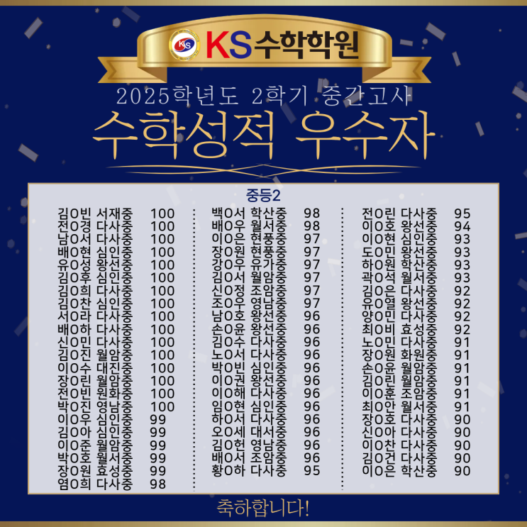 대구 다사수학 KS수학학원 2025학년도 2학기 중간고사 수학 성적 우수학생 및 향상학생 소개합니다!