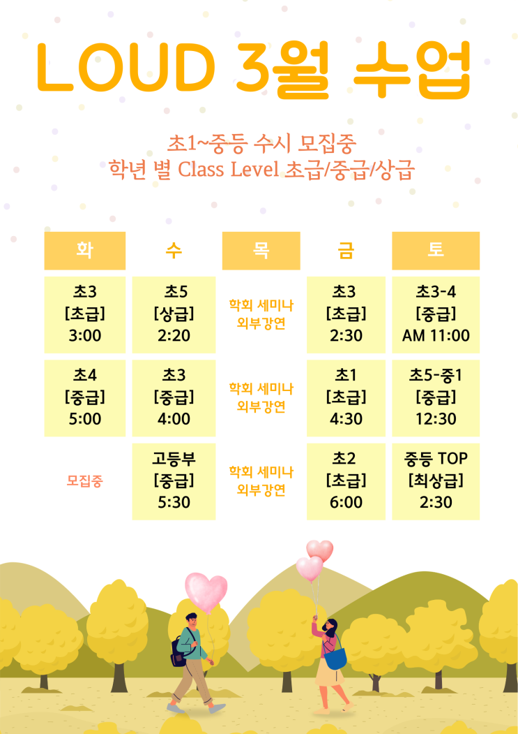 새싹이 움트는 3월입니다!! 3월은 1년 학습의 방향을 설정하는 중요한 시기입니다. 아이들이 스스로 생각하고 말하고 쓰는 힘을 기를 수 있도록 체계적으로 지도하겠습니다. 비문학 독해 구조 분석 찬반 토론 및 논리 전개 훈련 어휘력 확장 프로그램 마인드맵 기반 글쓰기 설계 [문학책] 안녕,거짓말 노트르담의 곱추 행복한 왕자 시골쥐와 도시쥐 윤동주'동시' 자청비 람세스 [기사문] 레모네이드 소녀 '비비안 하르' 탈북 난민 소년 '조셉 킴' 기후 난민이 뭐예요? 김정호가 <대동여지도>를 만들기 위해 백두산에 일곱 번 올랐다고? 3월엔 인물기사문이 꽤 많죠? 또우리 학생들의 지식이 움트고 사고가 싹....... <img src="https://blogthumb.pstatic.net/MjAyNjAyMjVfNDQg/MDAxNzcyMDEzNTI0MjA4.NtwVOKprLpobug53nqXgk_pOJDWgWb7riGX17r9DKMEg.93wHrlW8QeRbX2GCgLeRNZYaC4mxmKKVVYm7wngDrSIg.PNG/LOUD_OPEN_Level_Test_%BF%B9%BE%E0_%BE%C8%B3%BB_%284%29.png?type=s3" />