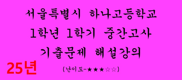 2026학년도 1학기 중간고사 시험대비 고등학교 1학년 1학기 중간고사 공통수학1 기출문제 기출문제 해설강의입니다. 서울특별시에 있는 하나고등학교 2025학년도 기출문제입니다. 2022개정교육과정입니다. 시험범위는 다항식, 방정식까지입니다. 난이도는 중으로 평이합니다. 필요한 항만 전개해서 미지수를 찾습니다. 판별식을 사용해되 되지만 인수분해해서 k 를 찾습니다. 주어진 조건을 이용해서 문제를 해결합니다. 나머지를 물어봤으므로 대입해서 계산합니다. 더 자세한 해설강의와 나머지 다른 문제들은 다음 동영상 강의를 참고하세요. 유튜브에 더 많은 해설강의가 업로드되어 있습니다. 2026 원본 시험지 제보 받습니다. 사진 찍어서....... <img src="https://blogthumb.pstatic.net/MjAyNjAzMTdfMzAg/MDAxNzczNzMwMjMwODkz.TXXfdWywBIKoXAv5a7QX59iyALby-DY9jLneSZaKP0Qg.o02u3YZ997ODfOY5ypdXwv--L2_RQfi7j7szF6u7NVgg.JPEG/1365.jpg?type=s3" />