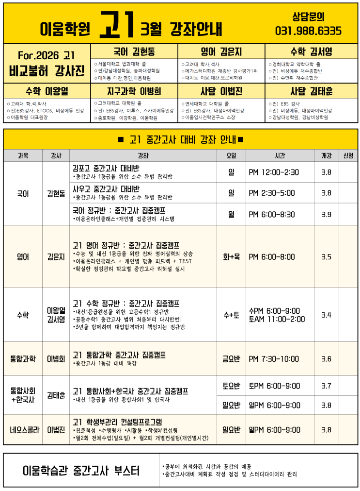 2026년 고1 학생들을 위한 3월 시간표 입니다. 이움학원 상담센터: 031-988-6335 <img src="https://blogthumb.pstatic.net/MjAyNjAyMjVfMTg0/MDAxNzcyMDEzMjY1NzQ2.5h-k0kCu2Gy4GDQrFQ2d03RXb1xeomWTSrBWnz5sCHYg.sTCvUqS68EeVG0KIVuf_fWn82DqN_qBWerCVr0BZzQMg.PNG/image.png?type=s3" />