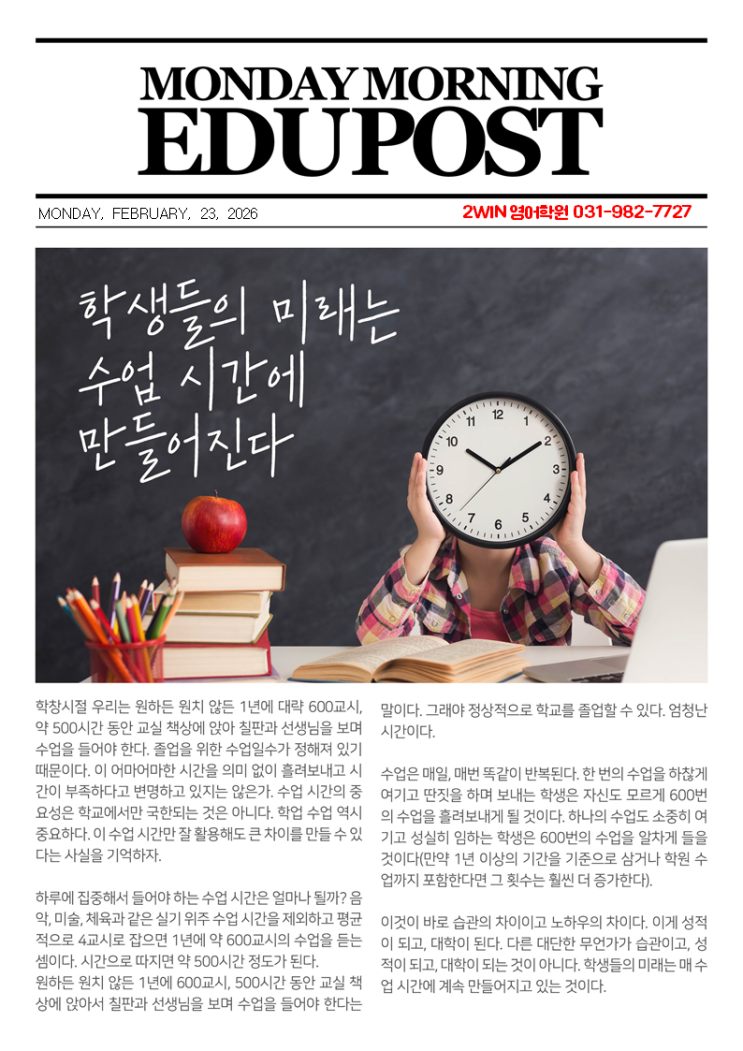 안녕하세요 무적원장입니다. 길고도 짧은 윈터스쿨이 끝나가고 있습니다 곧 새학기가 시작됩니다 그래서 !! 개벽학원은 고등 국어 1학년의 최선의 내신을 위해 학교별 반을 구성했습니다 솔터고 운유고 양곡고 호수고 그리고 신생 신양고 뿐만 아니라 주말 밖에 시간이 없는 통진고 까지 우선 내신부터 확실히 !! 라는 목표를 가지고 자신과의 싸움에서 조금씩 이겨나가고 있는 우리 개벽의 학생들 너무 기특하네요 다들 화이팅 !! 문의 031-998-4285 "실전에서 쓸 수 없다면 아는 것이 아니다." <img src="https://blogthumb.pstatic.net/MjAyNjAyMjRfMTk2/MDAxNzcxOTM2ODM1MTcw.RyDK6l5VsNDh0ZhQXEQTMXogqm177jd7vkwGkGOdNSQg.uz20uX7BTuF_7Y9o1HK4y83irOx30S8Bq6vm9L0IWocg.JPEG/20260224_%B0%B3%BA%AE%C7%D0%BB%FD%B5%E9.jpg?type=s3" />