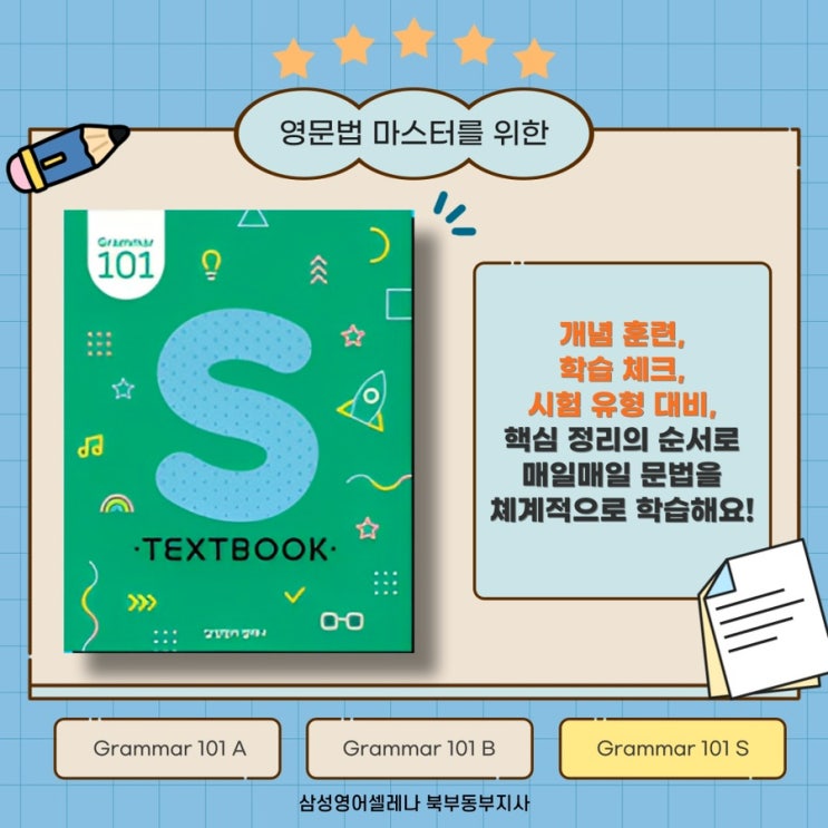 매주 월요일은 삼성영어셀레나 교재 메인 컨텐츠 살펴보는 날! 이 주의 교재는 <Grammar 101 S> ✏️Grammar 101 S 교재는 중등 내신의 기초를 다지기 위한 초등 필수 문법 특강 교재입니다. ✅ 목차 Unit1. to 부정사 Unit2. 동명사 Unit3. to 부정사 / 동명사와 함께 쓰는 동사들 Unit4. 등위접속사 Unit5. 명사절 접속사 Unit6. 부사절 접속사 Unit7. 사역동사와 지각동사 Unit8. 시간 전치사 Unit9. 장소 전치사 Unit10. 분사 Unit11. 수동태 Unit12. 관계대명사 -삼성영어 셀레나 Grammar 101 교재는 개념 훈련, 학습 체크, 시험 유형 대비, 핵심 정리의 순서로 매일매일 문법을 체계적으로 학습해요! ———————————....... <img src="https://blogthumb.pstatic.net/MjAyNjAyMjNfNzcg/MDAxNzcxODIzNTY2MzAy.AU-id0fS51DpoiQJA7HAcTda8UGpOYEbSLFnknWpiRgg.Z8TgaQQE3STeYHgArrgX5lm0ONq9Oze9TyPGJ4zRHrcg.JPEG/IMG_0272.JPG?type=s3" />