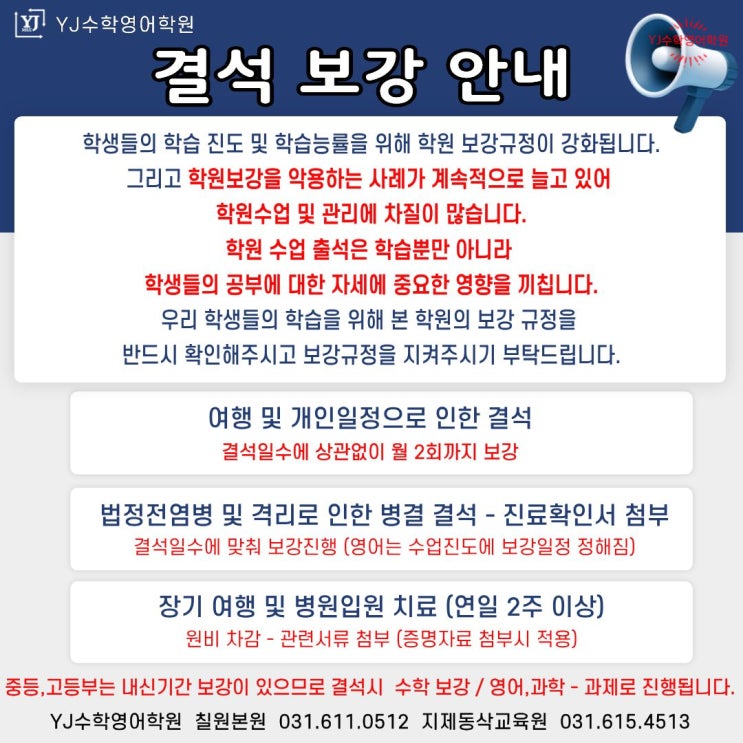 동삭동학원칠원동학원 YJ수학영어학원 보강안내문