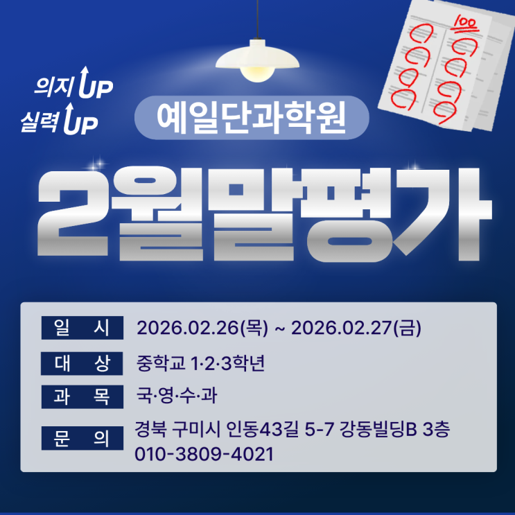 안녕하세요. 예일단과학원입니다. 이번 게시글에서는 2026년 첫 월말평가에 관한 내용을 공지해 드리려고 합니다. 중등부 학생들을 대상으로 하는 2월말평가는 26일(목) - 국어, 과학 27일(금) - 영어, 수학 시험을 치르고자 합니다. 실제 학교 시험과 유사한 긴장감과 환경을 경험할 수 있도록, OMR 카드 및 시험 대열 등의 실전과 같은 방식으로 진행할 예정인데요‼️ 이번 월말평가는 방학 동안 학습한 내용을 점검하고, 실력을 확인하기 위한 평가인만큼 학생들이 최선을 다해 임해주었으면 합니다. 문의 사항이 있으신 경우 010-3809-4021으로 전화, 문자 주시면 더욱 자세한 상담 도와드리겠습니다 #YALE #YEI #입시학원 #구미입시 #구....... <img src="https://blogthumb.pstatic.net/MjAyNjAyMjVfMTA5/MDAxNzcyMDEyNDQ4Mjg0.YkaxFvkB-7Nk3PoAsIBSUIh7jds_iv03F7HrTuBiTWcg.J3aGECGm8pWrNJ5497xUqTNWvwyPcGJSEC0Cza_CGjgg.PNG/%C1%A6%B8%F1%C0%BB_%C0%D4%B7%C2%C7%D8%C1%D6%BC%BC%BF%E4..png?type=s3" />