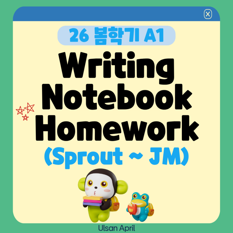 안녕하세요, 울산 April 어학원입니다. 이번주부터 26 봄학기가 시작되었습니다. "Writing Notebook 숙제" 안내드립니다. 해당 레벨 : Sprout 1,2,3 & Sapling 1,2 & JM 1,2 * 위의 레벨에만 해당되는 숙제이니 해당 레벨의 학생들은 꼭!!! 확인부탁드립니다. ( Starter/Seedbed/Seed레벨 해당사항 없음. ) [ Sprout & Sapling 레벨_ 롸이팅노트북 숙제 방법 ] 1) 수업시간에 배운 'Class Book' - 홀수과 Lesson 1, 3, 5, 7 만 해당 Class Book Lesson 1 의 페이지를 펼쳐서 수업시간에 적은 롸이팅을 보라색 롸이팅노트북 왼쪽 페이지에 옮겨서 연필로 예쁘게 써주세요!! 이때, 추가로 본인의 생각을 더 적....... <img src="https://blogthumb.pstatic.net/MjAyNjAzMDNfMjk2/MDAxNzcyNTE4NTEyNzk3.3FX2EZJasAVMVx83rrXUQed7vMr0iXpojGDthltd7Qkg.4gSEluIaJbSWhOilU0ETNHJkUZp2-EW3fXfTHrHw0fMg.PNG/%C1%A6%B8%F1%C0%BB_%C0%D4%B7%C2%C7%D8%C1%D6%BC%BC%BF%E4._%281%29.png?type=s3" />
