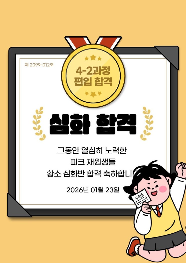 안녕하세요~ 세종시 초중등 심화수학 전문학원 피크에듀 세종1관 부원장 Luv쌤입니다! 저희는 요새 특강과 정규 수업을 하느라 눈코뜰새 없이 바쁜 나날을 보내고 있는데요, 저희 쌤들도 다들 힘들지만 열심히 공부하러 오는 삐약이들을 보고 힘을 내고 있습니다!! 지성이면 감천이다 너무 올드한가요? 하지만 이보다 더 확실한 격언은 없다는 걸 느끼게 해준 일이 생겼지 뭐예요♥ 바로바로!!!! 황소 4-2과정 편입시험에서 당당하게 심화반 합격★ 정말 열심히 해준 친구들이었기에 겉으로 티는 안내도 시험일이 가까워질수록 합격은 당연하다고 생각하고 있었는데요. 짧은 기간 동안 다른 학원도 다니면서 피크에서 내준 적지 않은 숙제량도 잘....... <img src="https://blogthumb.pstatic.net/MjAyNjAxMjVfMjc2/MDAxNzY5MzMwNjcxNDA1.0VtBWDes9Lc-RiTrBdTsins9IL3vRjct1ljMdS9L6l0g.K_ghaJ4Ry3Up_VkuYrOhYpHMpEMbakrFcv5fAlHSXQYg.JPEG/260125.jpg?type=s3" />