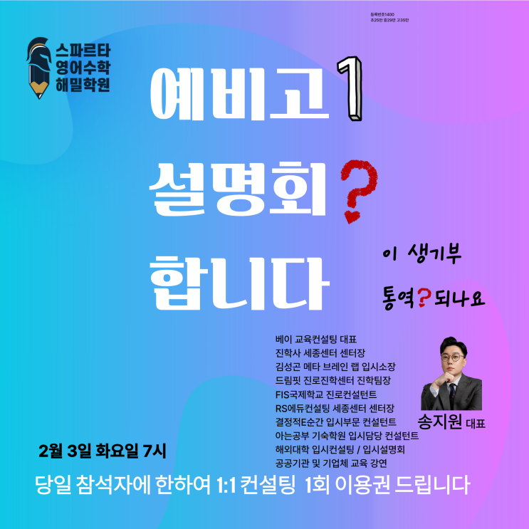 고교학점제 시대, 대입 성공을 위한 생기부 전략 설명회 안녕하세요, 스파르타영어수학학원 원장 임채호입니다. 이번 설명회에서는 입시 전문가인 베이 교육 컨설팅 송지원 대표님을 모시고, 고교학점제 도입에 따른 생기부 작성의 핵심 전략과 구조에 대해 깊이 있는 정보를 나누고자 합니다. 손자병볍의 명언중에 "먼저이겨놓고 싸운다" 는 말처럼, 생기부 중심의 입시제도에서는 단순히 열심히 하는것을 뛰어넘어 "학생의 전공적합성, 성장서사, 잠재역량" 을 보여줘야됩니다. 이미 이겨놓은 싸움을 하려면, 지금이 바로 전문 입시컨설팅을 시작해야 할 때입니다. 그 시작을 함께할 설명회에 꼭 참석해 보십시오. 일시: 2....... <img src="https://blogthumb.pstatic.net/MjAyNjAxMjdfOCAg/MDAxNzY5NTE5NDA4ODU5.B95fmAB75isqOl6mhSyovcKUtAKKPdEg9abcPlMg7jkg.lvXBhl2qaBdYIMwwxK4A9odW9aGS8t96DPIBTTwZxCUg.PNG/%BF%B9%BA%F1%B0%ED1%BC%B3%B8%ED%C8%B8.png?type=s3" />