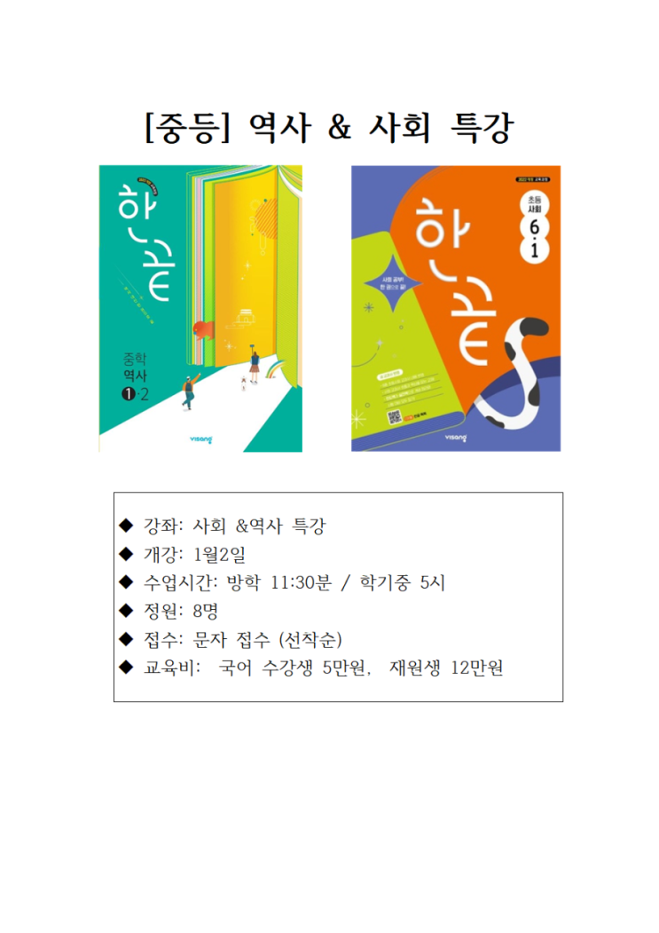 학부모님 안녕하세요. 세계사 특강 종료 및 사회&중등 역사 특강 안내드립니다. 신청기간: 12월19일~ 26일 감사합니다. <img src="https://blogthumb.pstatic.net/MjAyNTEyMTlfMTgw/MDAxNzY2MTMzODM4OTM2.DypjHVi3yN6BdCesc557GlfAJM-7FjXPIewmX19rQmIg.aB8LdJhYBewXiLuVkPRj5DXsceitbGKYRywc1nNQ3dAg.PNG/900%A3%DF1766131910461.png?type=s3" />