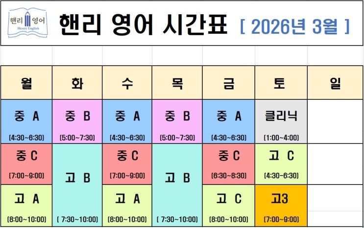 안녕하세요 핸리영어 유주국어 학원입니다. 3월 시간표 안내 입니다. 영어는 중등 A~C반 까지 레벨 순으로 나누어져 있으며 각 반의 정원은 5명입니다. 3월 마지막 주부터 1학기 중간고사 대비 들어갑니다. 고등 A~C반은 레벨 및 학교 별로 나누어져 있으며 월,수반은 백석고,정발고 1 화,목반은 정발고1 학생들로 구성되어 있습니다. 정원은 4명입니다. 고등 C반은 특목고나 주중에 시간이 안되는 학생들을 위한 반이며 모집중입니다. 고3은 CUSTOM반으로 운영되어 개별 수업입니다. (일요일도 신청시 수강 가능합니다) 국어는 중등2, 중등3반이 있으며 레벨 별 수업을 지향해서 학년이 섞일 수도 있습니다. 고등은 학교 및 시간표에 따라 고 A,....... <img src="https://blogthumb.pstatic.net/MjAyNjAyMjZfNTgg/MDAxNzcyMDk1NzM5MjE1.lfE8BqAnRbkn6NMJDoq7qqWBJY5qGhhgaD81oto4x50g.V7orPztYl6EMaatbvoeSP80bOO3j7duCfS5uMshYvyQg.JPEG/%3F%95%B8%EB%A6%AC%EC%98%81%3F%96%B4_3%3F%9B%94_%3F%8B%9C%EA%B0%84%ED%91%9C.jpg?type=s3" />