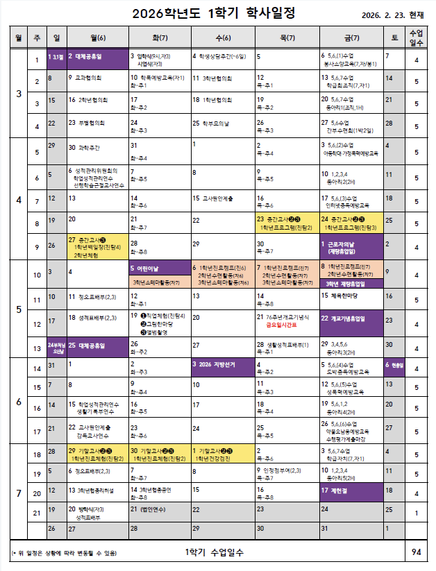 2026학년도 선정중학교 학사일정