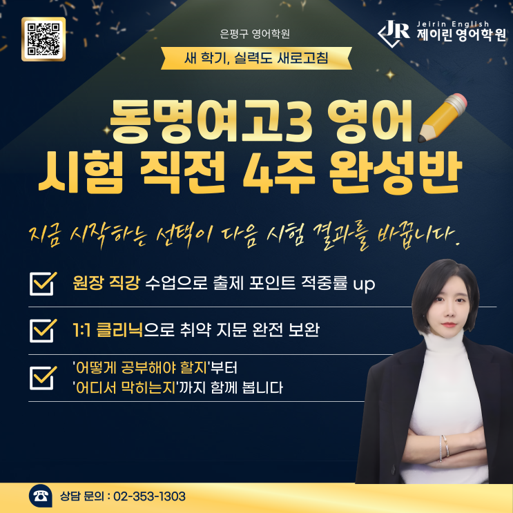 동명여고 영어학원 동명여고3을 위한 중간고사 4주완성반 (feat. 원장 직강) 동명여고 3학년 친구들을 위해 중간고사 직전 4주간 제이린 원장T가 내신 총정리 수업을 진행합니다. 신규수강은 가능하나, 시험범위에 해당하는 범위가 1회독은 되어 있어야 가능합니다. (제이린 재원생 1회독 완료) <img src="https://blogthumb.pstatic.net/MjAyNjAzMjBfMjgz/MDAxNzczOTgyMzY0NDY0.zvIXZHnRAUnS7zFksXgvyOiXdhDxG4WmL7wstTjCvLEg.6pBVnPSJFoeIUzt_7LPAWyhEeMhWPyteWeQ-r9826dwg.PNG/%C1%A6%B8%F1%C0%BB_%C0%D4%B7%C2%C7%D8%C1%D6%BC%BC%BF%E4..png?type=s3" />