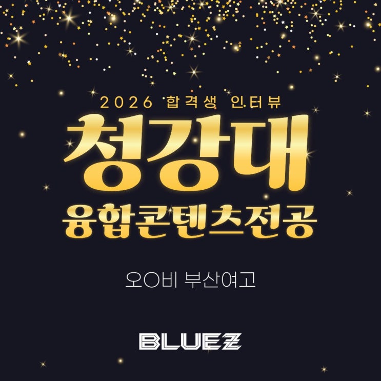 안녕하세요. 부산 대표 만화학원 블루젯 만화학원입니다. 오늘 준비한 인터뷰는 청강문화산업대학교의 융합콘텐츠전공에 합격한 오O비 학생의 인터뷰 입니다. 그럼 청강대 합격생의 인터뷰를 들어 볼까요? 이름 I 오O비 학교 I 부산여고 1. 청강대 융합콘텐츠에 지원하게 된 이유는? 학원에 다니기 전부터 청강대 진학을 희망하고 있었습니다. 가장 가고싶은 학교였습니다. 2. 내신 관리는 어떻게 했나요? 솔직히 내신 관리를 하지 않았습니다만만, 지금 생각해보면 희망하는 학교나 더 좋은 학교에 진학하기 위해서는 내신 관리도 확실히 해야 했다고 느낍니다. 3. 실기 시험은 어땠나요? 시험 당일에는 전반적으로 크게 긴장되지 않았고 자신감....... <img src="https://blogthumb.pstatic.net/MjAyNjAxMTBfMjgx/MDAxNzY4MDQxMzY4NzA2.XAp92Wu3E7at5TWtaZXyt_7MB4oQKx3Y3qap34orl-gg.nt83Bt5QrtmSCgqurtxGOZK-PT-VIZefe7IfjWov-skg.JPEG/13.jpg?type=s3" />