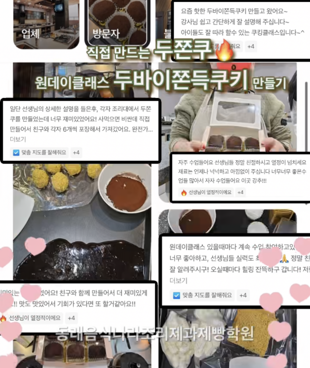 반갑습니다. 동래음식나라조리제과제빵학원입니다. 오전,오후 타임 전부 오픈하자마자 빠르게 마감되었던 두쫀쿠! 이번 수업도 즐겁게 진행되었습니다 많은 분들이 참여해 주셨고 동글동글 예쁘게 만들어 가셨답니다.ㅎㅎ 많은 분들이 참여해 주셨고 동글동글 예쁘게 만들어 가셨답니다.ㅎㅎ 처음 베이커리를 접하시는 분들도 안정적으로 완성할 수 있도록 지도하여, 모든 수강생분들께서 만족스러운 결과물을 완성하셨습니다. 선물용으로 준비하신 분들도 계셨고, “제가 먹으려고요!” 하시던 분들도 계셨는데요 어린 꼬마 쉐프들도 싱글벙글해 하며 가져갔네요~ 다들 한입 드셔보시고는 너무 맛있다며 만족도 최고 ✨ 달콤함 가....... <img src="https://blogthumb.pstatic.net/MjAyNjAyMTlfNTkg/MDAxNzcxNDcxNDc1MTIy.b6Moy8GBM_WyjLloqaVJgqwCrAt6iUl6C5GUBQmlNOwg.6iS5hBenpUddPXv4N-vMGgtxC4cdWnfcVz5bTKjPzE4g.PNG/%BF%E4%B8%AEKakaoTalk_20260219_121224280_09.png?type=s3" />