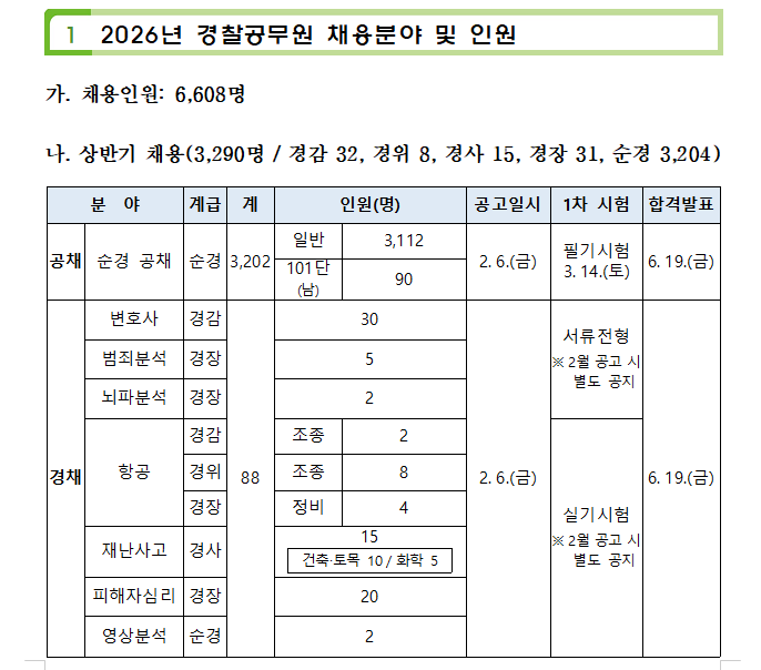 안녕하세요, 경찰공무원이라는 멋진 꿈을 향해 오늘도 고군분투하고 계실 모든 수험생 여러분, 커넥츠프랩 부산 덕천점입니다! 2026년의 시작, 모두들 힘차게 달리고 계신가요? 설레는 마음으로 새해를 맞이했을 텐데요, 여러분의 심장을 더욱 뜨겁게 할 소식이 찾아왔습니다! 바로 2026년 경찰공무원 채용 분야 및 인원 발표 소식입니다! 2026년 경찰공무원 채용, 얼마나 뽑을까? 드디어! 많은 분이 손꼽아 기다리던 2026년 경찰공무원 채용 규모가 공식 발표되었습니다. 올해도 많은 분이 경찰의 꿈을 이룰 수 있도록 넉넉한 인원을 선발할 예정인데요, 상반기와 하반기로 나누어 진행되는 채용, 어떤 분야에서 얼마나 선발하는지 궁금하....... <img src="https://blogthumb.pstatic.net/MjAyNjAxMTBfMTAw/MDAxNzY4MDA5NjUyMzQ2.FUZFTqLE27UcifBOssWeiBAAFivQ6g04kiQC4sCiCk8g.HPoxqWvFSRjbveh_iNYnw-gb75MoQtfnqJ6hXH5YHyog.PNG/image.png?type=s3" />