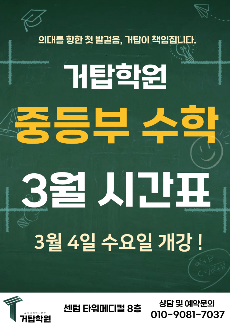 안녕하세요! 거탑학원입니다. 저희 원에서 중등부 수학을 3월 4일 개강하게 되었습니다. 자사고, 일반고 내신 최상위학원의 명성을 중등부에서도 이어 가겠습니다. 중등시작부터 고등 내신 및 입시까지 철처하게 책임겠습니다. | 거탑 중등부 수업 관리 시스템 수업 전후 철저한 관리 시스템으로 수업 이해도 완성!! -수업 전 테스트 + 수업 + 수업 후 테스트 확인 + 과제 점검 + 수업 중 이해도 확인 소수 정예반 - 개인별 밀착 관리 시스템 8주 과정으로 실력을 탄탄하게 !! | 중등 수학 시간표 << 중등부 고등 수학 시간표 >> << 중등부 중등 수학 시간표>> 의대를 목표로 하는 학생이 선택한 독보적인 수....... <img src="https://blogthumb.pstatic.net/MjAyNjAyMjZfODgg/MDAxNzcyMDk3MTYzNDE2.9O1-w1vJl7qQ97qOkNPtTICAX5YbfMxkvZno5WJToOog.DGMdar1_MHzuz3GHU4ZsqfnnbPALtHLT1UNxFE-5o6gg.PNG/%C1%DF%B5%EE_%BC%F6%C7%D0_3%BF%F9_%BD%C3%B0%A3%C7%A5_%281%29.png?type=s3" />